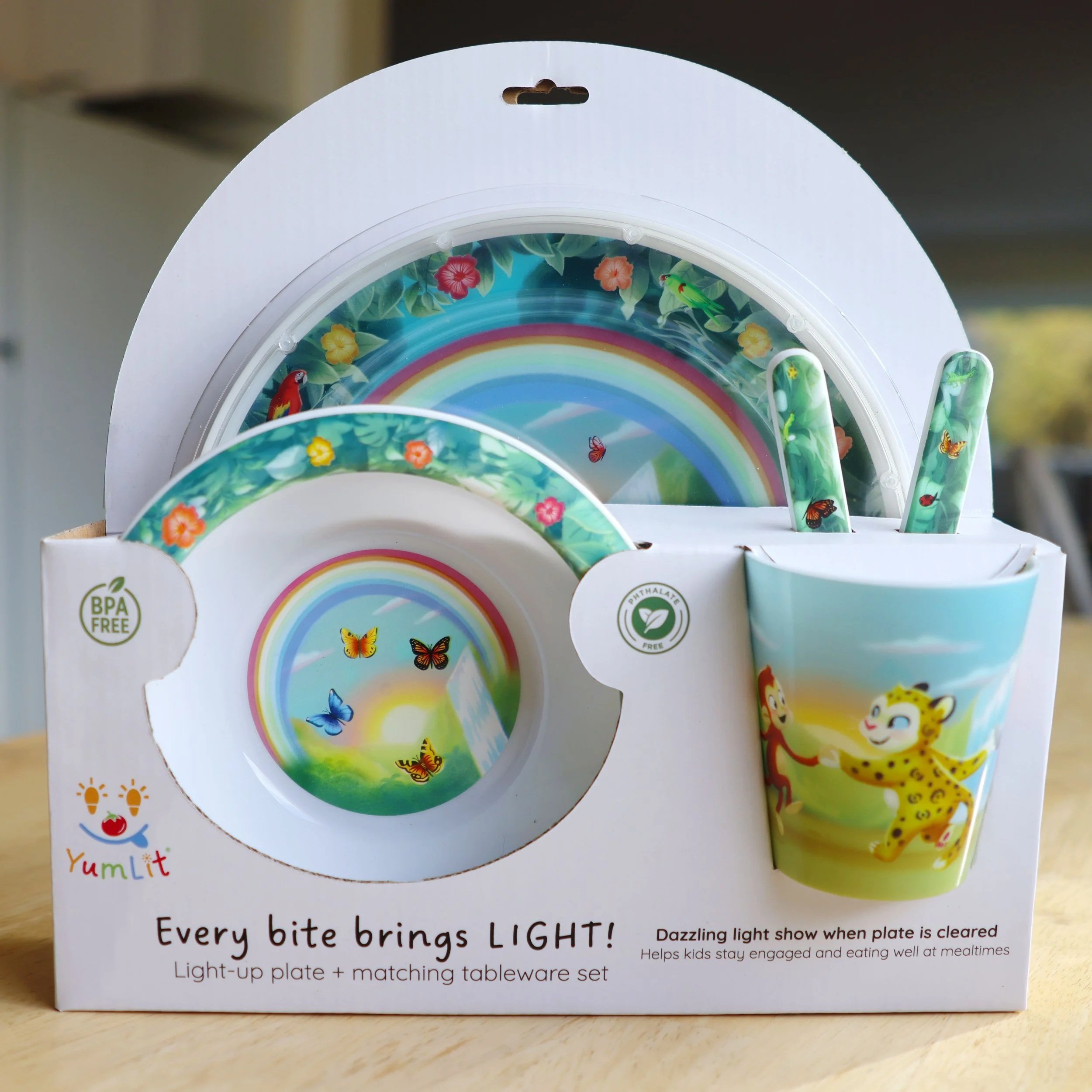 Swing into mealtime and explore the wonders of the wild! As your little naturalist eats their way through the jungle, colorful flowers burst to life with each bite. When the plate is cleanโAaaaah!โa rainbow appears, butterfy wings glint in rays of sunshine, a waterfall shimmers, and the setting sun paints the sky!