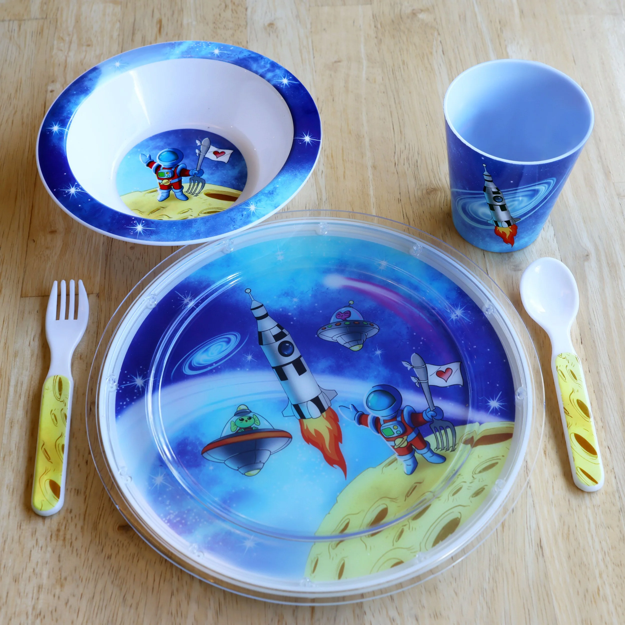 Blast off at mealtime and discover the wonders of space! As your little explorer eats their way through the galaxy, stars twinkle with each bite. When the plate is cleanโwhoosh!โa glowing comet blazes by, UFOs blink and a galaxy shimmers with light, the rocketโs fiery trail lights up the sky, and our little astronaut sends waves of love across the galaxy.